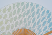 扇面の両面に、抗ウイルス・抗菌機能のある漆喰を塗布しています。成分は強アルカリ性になりますが、表層は空気中の二酸化炭素と反応して中性化していますので、手に触れても問題なくご使用いただけます。 表にはヒイラギの葉っぱを描いています。左から右手にかけてグラデーションになっています。裏面は白無地。