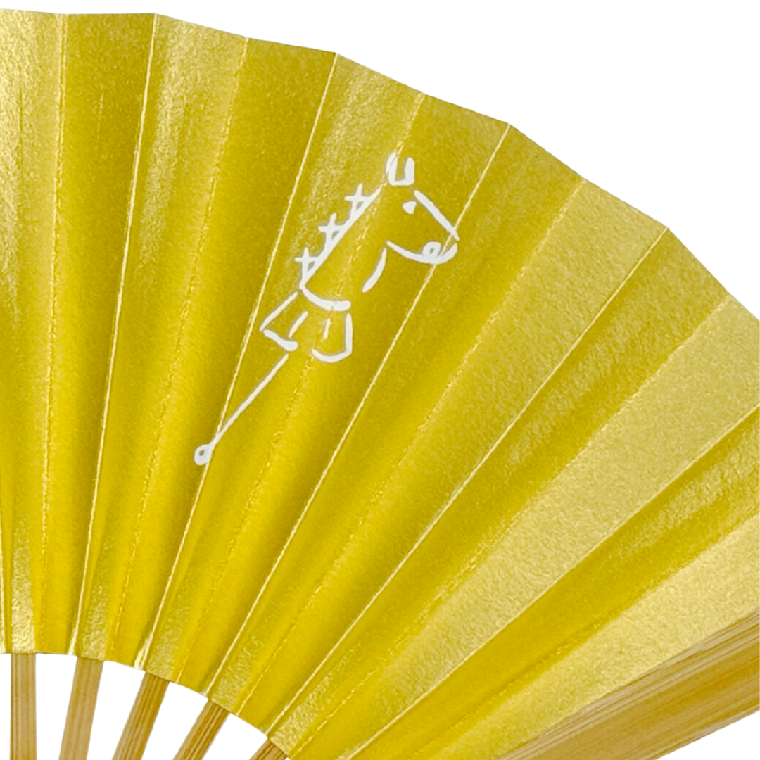 干支「午(うま)」を題材とした6寸の茶席扇。金地の華やかさと白竹の爽やかさが調和し、存在感のある仕上がりとなっています。干支の力強さを感じさせる図柄です。