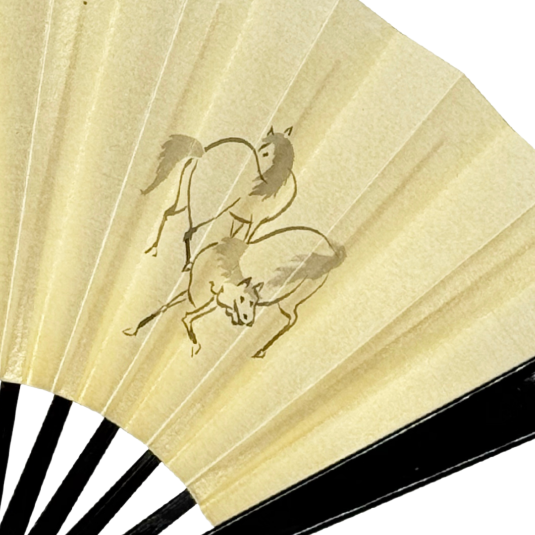 干支「午(うま)」の駿馬を墨の濃淡で表現した茶席扇です。力強さと気品を兼ね備えた馬の姿は、静かな中にも生命力を感じさせます。金地の華やかさとは異なる落ち着いた趣で、墨絵ならではの風合いが新春の空気に映えます。